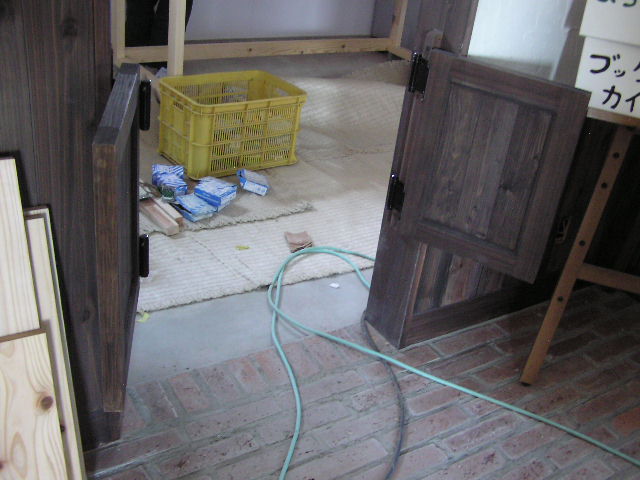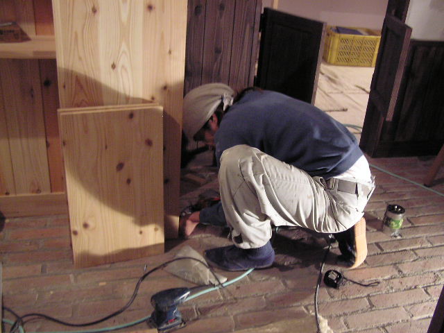 Aさん。雨が降って仕事を早仕舞いにしたので、顔を出してくれました。レンガの出っ張りをサンダーで削ってくれています。