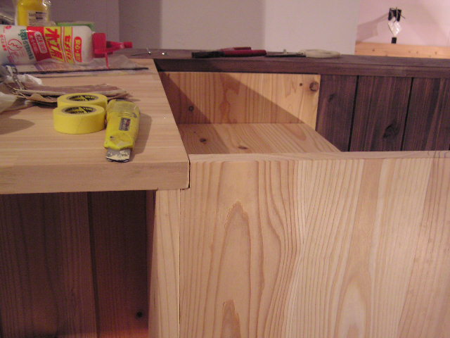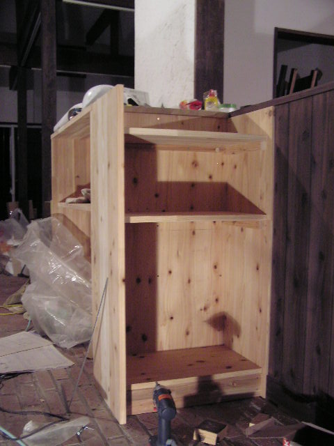 棟梁も他の現場に行く前に、レンジフードを付けに来てくれました。棟梁が半分隠れるくらいの大きさです。昨日棟梁が作ってくれました。あまりにも綺麗な出来でレンジフードにはもったいない感じです。