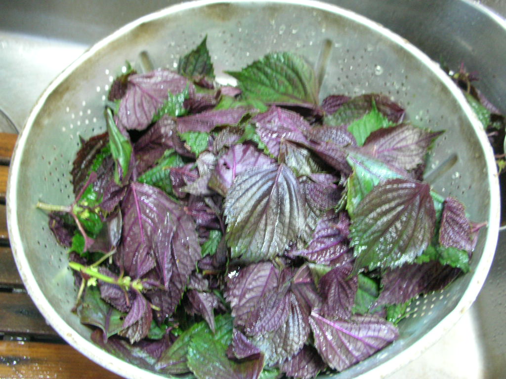 洗った赤しそ。スーパーの「地場産」コーナーで、偶然にも有報堂が今年梅干しの梅を買いに行ったりんご農家さんのしそを発見。完全有機で、りんご以外にもいろいろ作っていらっしゃるようです。
