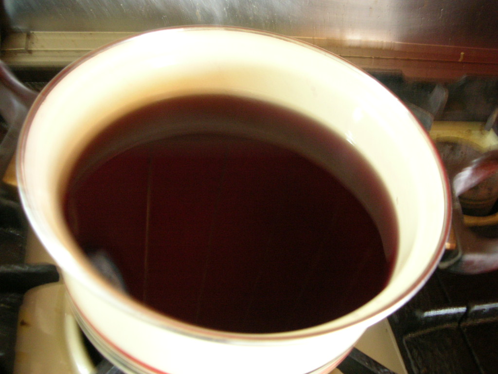 まず2リットルの水を沸かし、赤しそを入れてゆでます。赤いしそが青く(!)なって、再び沸騰したらしそを取り出して漉します。この時点では赤黒い色。