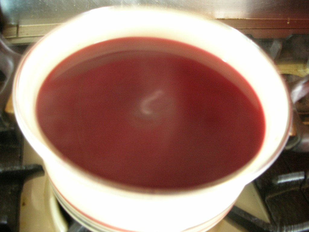 赤黒かったのが、鮮やかな赤紫色に変わりました。軽くまぜて冷ませばできあがり。