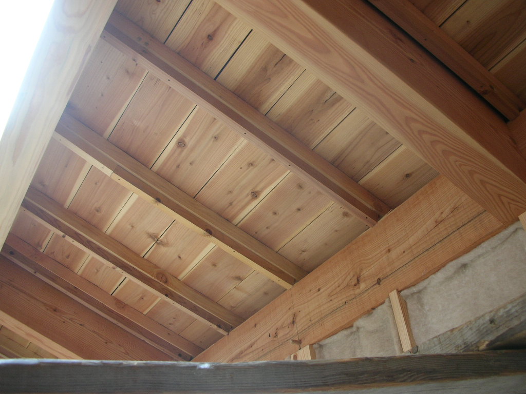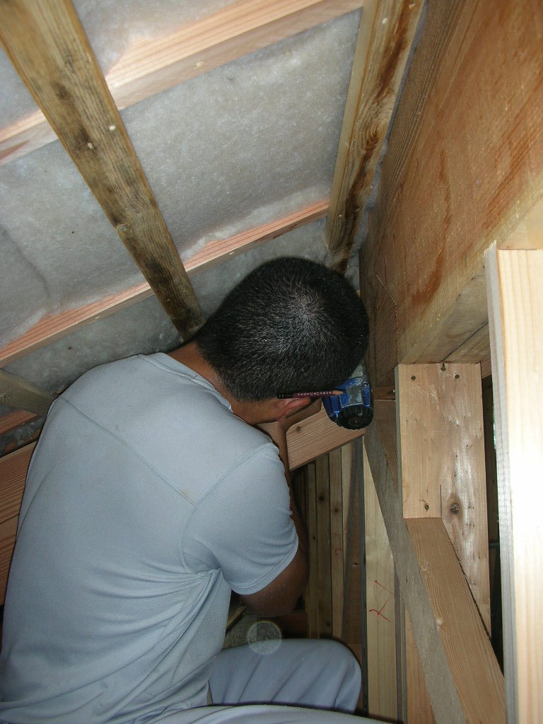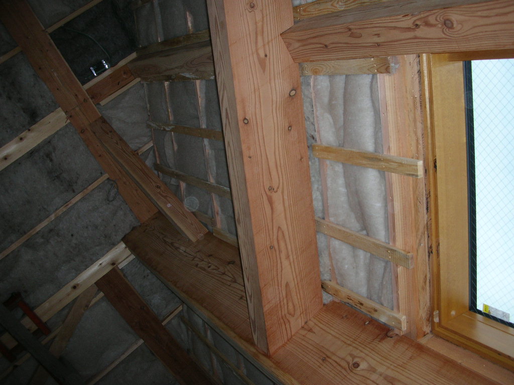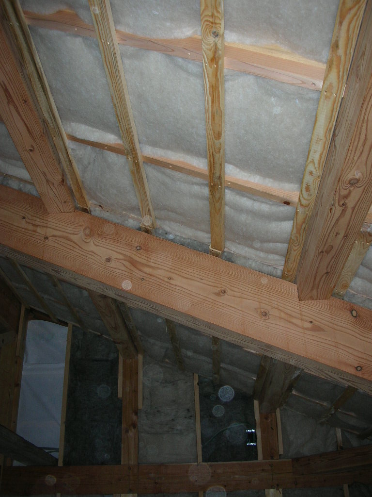 ひと息ついて、天井の胴縁を張る。昨日断熱材を入れたカイロスペースの上です。