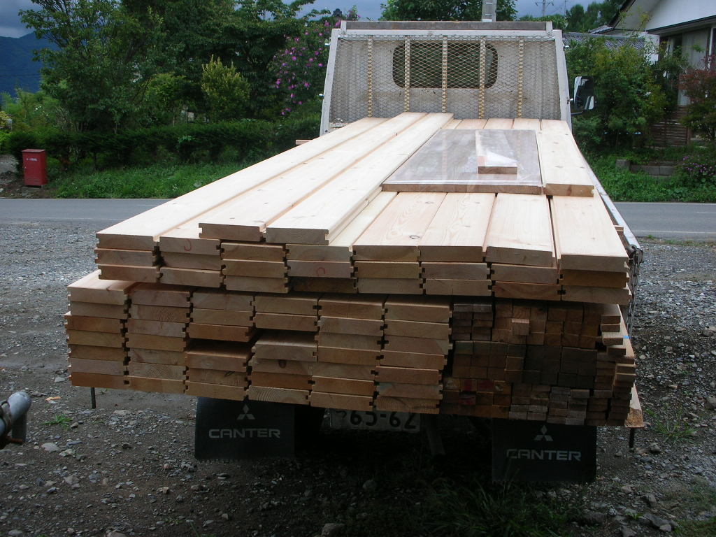 これを3人ががりで室内へ。床材は1枚ずつ柱の間を通して2階へ運びます。かなりの力仕事を小一時間。Hさんありがとうございます。