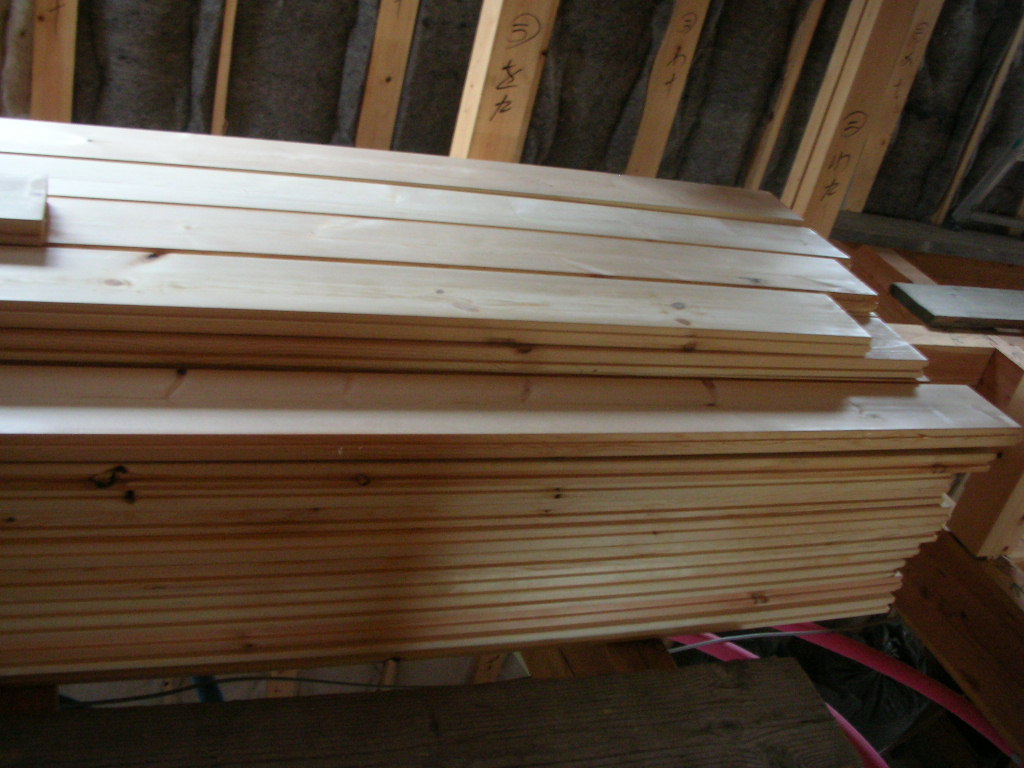 天井用の胴縁と、平たいのは2階の床材です。
