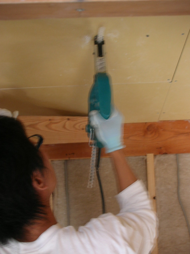 わが代表は天井張りを。緻密な作業を繰り返しています。連続打ちの釘打ちも軽々と使いこなしています。