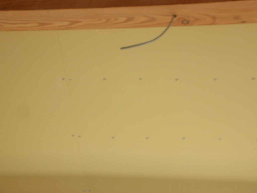 1枚張り終わったところ。1枚の石膏ボードに、20本以上釘を打ちます。しかも傾斜があるので釘打ち機械が垂直に入らないところもあり、難易度高しです。