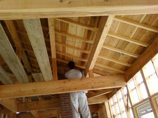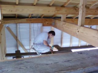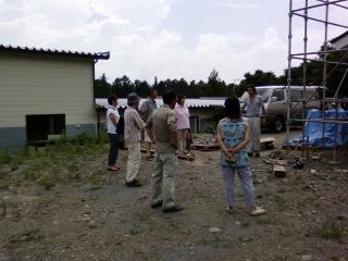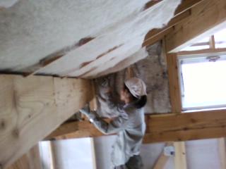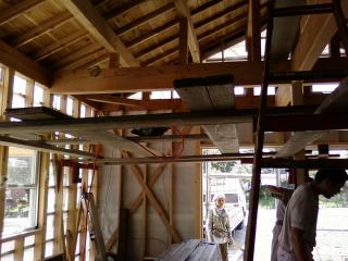 室内作業に切り替え。今日は天井に断熱材を入れます。 熱い空気は上へ、ということで天井は兎に角暑い。ただでさえ暑いのに断熱材は毛布のようなもので、いじっているだけで暑い素材。汗まみれになって作業です。床に汗が落ちていきます。 今日は朝からHさんが助っ人に 9・10日の土日は、出稼ぎやら企画やらで現場にはいません。 また、来週以降お越しください。
