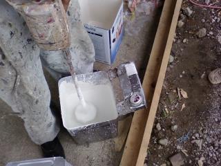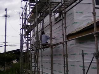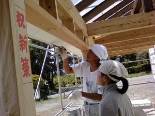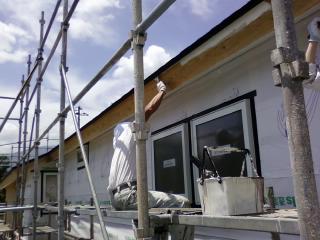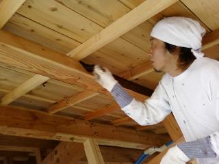 作業を始めてすぐに雷雨のため、破風・軒天の塗装は中止。屋根の下での作業へ。 入り口のスロープの梁を塗装します。スロープは屋根があるので作業が出来ます。 午前中はひたすら塗装屋さん。 |