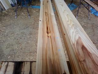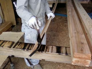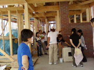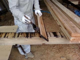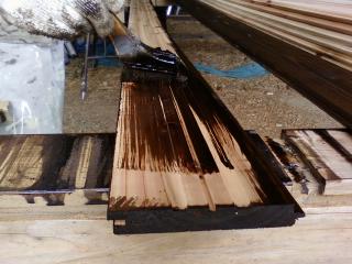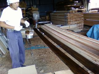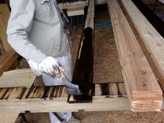 外壁材の塗装中、ラジオを聞きながら作業。