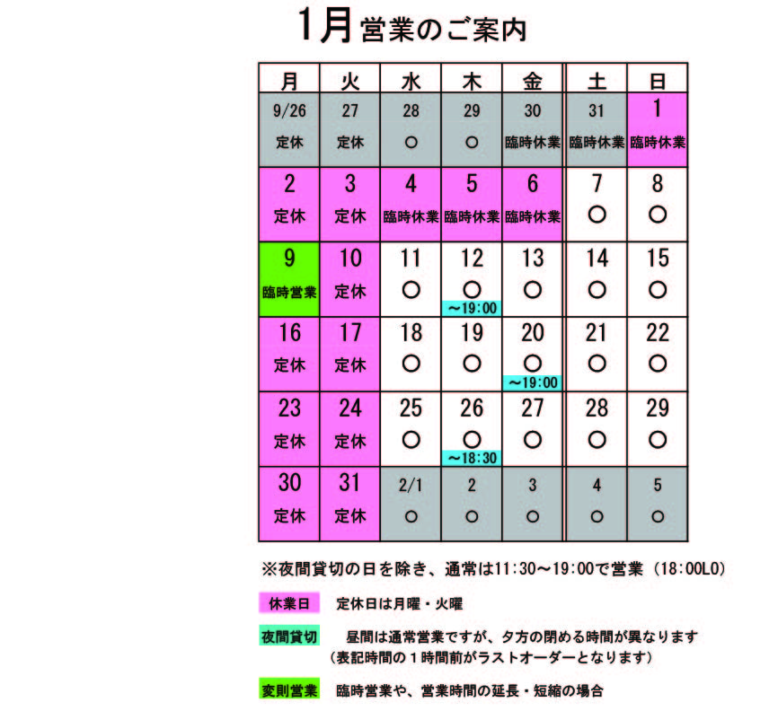 今年も、コロナに振り回された一年でしたが、どうにか無事年越しを迎えることができました。 あいも変わらず色んなことがあり、てんやわんやですが、今年はコロナ禍を乗り越えて、あらたにジグザグブックなどの 滑り込みでできたので、来年への弾みとなったかなと思っています。 今年も乗り切れたのは、皆様のおかげです。 お客様や仲間達に支えられて今年も一年間無事乗り切ることができました。ありがとうございました。 来年もコロナにも負けず何にも負けずに頑張りたいと思っています。来年は、またあらたなイベントを再やりたいなという希望も持っています。よろしくお願いいたします。 皆様、どうぞよいお年を・・・ ※年末年始は、12/30から1/6までお休みとなります。1/7から通常営業です。 ※年末年始変則営業につき今日、明日は月・火ですが、営業しています。皆さまぜひお越しください。 1月の営業のお知らせです。 月・火が定休日ですが、年末年始やハッピーマンデーの関係で不規則営業になっています。 ↑↑↑ クリックすると大きくなります。 1月変則営業 ※年始休業は1/1〜1/6。 9日(月・祝)祝日のため臨時営業 貸切の予定は、 1月 12日(木)夜貸切 20日(金)夜貸切 26日(木)18:30〜貸切(L.O.17:30) となっております。夜貸切の日は、通常営業は19:00までです。(いずれも通常営業の1時間前がL.Oになります) 貸切以外は通常営業をしています。 夜の営業も貸切日以外は受け付けております。 お気軽にお問い合わせください。 ※カイロは完全予約制にて営業しております。早めに電話または窓口でお問い合わせ・ご予約をいただきますようお願いいたします。