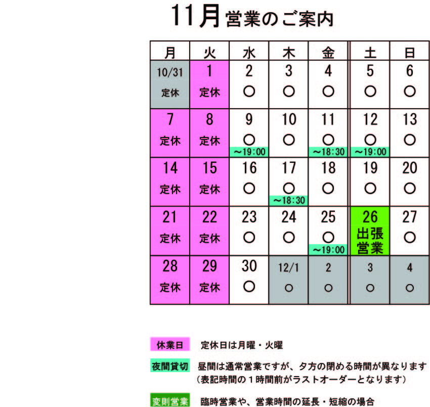 11月の営業のお知らせです。