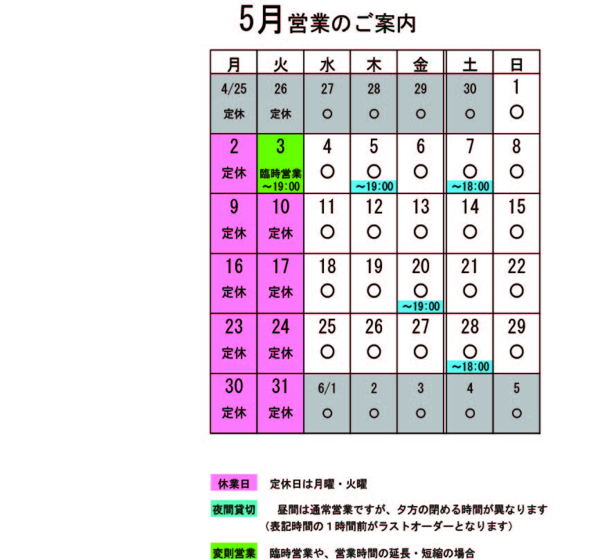 5月の営業のお知らせです。 月・火は定休日ですが、G.W.の関係で営業している日もあったり色々です。 ↑↑↑ クリックすると大きくなります。 5月変則営業 3日(火)臨時営業 貸切の予定は、 5月 3日(火)夜貸切 5日(木)夜貸切 7日(土)18:00~貸切(L.O.17:00) 20日(金)夜貸切 28日(土)18:00~貸切(L.O.17:00) 夜貸切の日は、通常営業は19:00までです。 5月は、貸切ではなくても予約が入っている日が多くなっています。ご来店前にお席のお問い合わせを頂けると確実です。 貸切以外は通常営業をしています。 ぜひお立ち寄りください。 夜の予約営業も貸切日以外は受け付けていますので、 お気軽にお問い合わせください。 ※カイロは完全予約制にて営業しております。早めに電話または窓口でお問い合わせ・ご予約をいただきますようお願いいたします。 忙しさにまけて、ブログの更新ができずにいました。反省(._.)これからは少しまじめにやる予定… 4月に作ったお弁当。 安心安全、完全手作りの 今回のお弁当は、いなり寿司、肉野菜巻き、タコのから揚げ、桜えびの卵焼き、ふきのとうチーズ焼き、菜の花の辛子和え、大根の梅酢漬けでした。これにほうじ茶プリンがついてこれで1,500円でした。お得です。春っぽいお弁当になりましたよ。 有報堂のお弁当は、野菜が多くて味付けも薄めにしているので、ヘルシーです。ご希望があれば飲み物やデザートもお付けします。 単価は1000円〜、個数は昼10個〜・夜20個〜で承ります。個数によって単価はご相談に応じます(お安くできることもあります)。有報堂のお弁当はいかがですか?お弁当は予約制です。スタッフにお気軽にお問い合わせください。 ※4月の営業のお知らせは3/24の記事(■■■)にあります。ブログ右側の営業カレンダーもご覧下さい。 ※カイロは完全予約制にて営業しております。早めに電話または窓口でお問い合わせ・ご予約をいただきますようお願いいたします。 ちょっと前に作った安心安全完全手作りの 雑穀入り五分づきごはん、大根とお豆腐揚げの田楽(山椒味噌)、生姜焼き、人参マリネ、厚焼き玉子でした。これで1,000円です。 有報堂のお弁当は、野菜が多くて味付けも薄めにしているので、ヘルシーです。ご希望があれば飲み物やデザートもお付けします。 単価は1000円〜、個数は昼10個〜・夜20個〜で承ります。個数によって単価はご相談に応じます(お安くできることもあります)。有報堂のお弁当はいかがですか?お弁当は予約制です。スタッフにお気軽にお問い合わせください。 ※4月の営業のお知らせは3/24の記事(■■■)にあります。ブログ右側の営業カレンダーもご覧下さい。 ※カイロは完全予約制にて営業しております。早めに電話または窓口でお問い合わせ・ご予約をいただきますようお願いいたします。