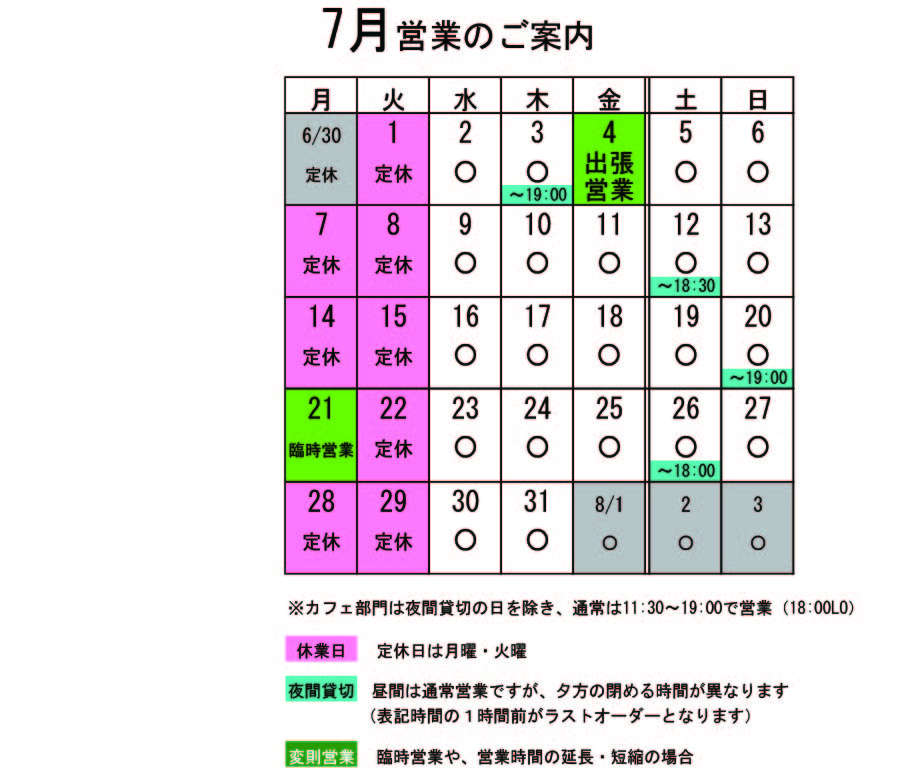 外界は暑いそうですね。標高が高い有報堂は割りと涼しいです。朝晩はまだ20度切ってます。今日は、曇でちょっと蒸すかなという感じ。 が、メニューは着々と夏バージョンに。モッフルも夏仕様、 「モッフルのなかで、一番美味しい」(有報堂A)と言われている、モッフルブルーベリー。 愉快な仲間(上伊那民商青年部)の大和屋農園の美味しいブルーベリーで、フレッシュなソースをつくりました。 カリッともちもちに焼き上がったモッフルに、ヨーグルトアイスとブルーベリージャムとをトッピング。ブルーベリーとヨーグルトの組み合わせは鉄板です。ちょっと甘酸っぱい、ボリュームたっぷりのスイーツです。 「夏に餅!?」と尻込みしないで召し上がれ。 ※7月の営業のお知らせは6/27の記事(■■■)にあります。ブログ右側の営業カレンダーもご覧下さい。 ※カイロは完全予約制にて営業しております。早めに電話または窓口でお問い合わせ・ご予約をいただきますようお願いいたします。 ついに今年も半年が終わった…今年の年初の目標はブログをまめに更新するだったのに… 反省して頑張ります。 今日は涼しいけれども、暑い日が続いて一気に注文が増えているのは、 +100円で納豆付きに、米麺にチェンジは+200円、小ライス付きも+200円。 有報堂定番のねばねばどんぶりの、うどんバージョン。 ねばねばは、有報堂カイロ部門一押しの食材です。ねばねばはコンドロイチンが豊富! とろろ+海藻+青菜+きのこで、コンドロイチンと免疫を高める食材が一皿で摂取できるすぐれものです。 ここ数年の夏の暑さで、夏を乗り切れるか不安なあなた!のどごし爽やか、栄養価が高いねばねばうどんで夏バテ予防をどうぞ。 「毎日食べたい」と言うお客様もいるくらい美味なねばねばうどんを食べに有報堂へGo! ※7月の営業のお知らせは6/27の記事(■■■)にあります。ブログ右側の営業カレンダーもご覧下さい。 ※カイロは完全予約制にて営業しております。早めに電話または窓口でお問い合わせ・ご予約をいただきますようお願いいたします。 7月の営業のお知らせです。 月・火が定休日ですが、祝日の関係で不規則営業になっています。 ↑↑↑ クリックすると大きくなります。 7月変則営業 4日(金)終日出張営業 21日(月)臨時営業 貸切の予定は、 7月 3日(木)夜貸切 12日(土)18:30~貸切(L.O.17:30) 20日(日)夜貸切 26日(土)18:30~貸切(L.O.17:30) となっております。夜貸切の日は、通常営業は19:00までです。(いずれも通常営業の1時間前がL.Oになります) 貸切以外は通常営業をしています。 ぜひお立ち寄りください。 夜の予約営業も貸切日以外は受け付けていますので、 お気軽にお問い合わせください。 ※カイロは完全予約制にて営業しております。早めに電話または窓口でお問い合わせ・ご予約をいただきますようお願いいたします。 先週作った安心安全、完全手作りの いなり寿司、海老チリ、ローストポーク、チキンカツ、きゃらぶき、天ぷら(こごみ・たけのこ)でした。これに、チョコバナナパウンドがついて2,000円です。お稲荷さんは、中が見えませんが、ひじき・人参・舞茸の混ぜ寿司が入っています。ビックサイズのお稲荷さんで有報堂っぽいです(^o^) 有報堂のお弁当は、野菜が多くて味付けも薄めにしているので、ヘルシーです。ご希望があれば飲み物やデザートもお付けします。 単価は1000円〜、個数は昼10個〜・夜20個〜で承ります。個数によって単価はご相談に応じます(お安くできることもあります)。有報堂のお弁当はいかがですか?お弁当は予約制です。スタッフにお気軽にお問い合わせください。 ※6月の営業のお知らせは5/25の記事(■■■)にあります。ブログ右側の営業カレンダーもご覧下さい。 ※カイロは完全予約制にて営業しております。早めに電話または窓口でお問い合わせ・ご予約をいただきますようお願いいたします。 |