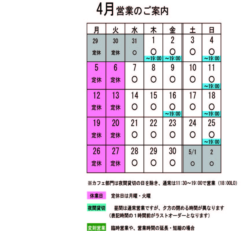月・火が定休日です。 ↑↑↑ クリックすると大きくなります。 貸切の予定は、 4月 1日(木)夜貸切 2日(金)夜貸切 4日(日)夜貸切 11日(日)夜貸切 16日(金)夜貸切 18日(日)夜貸切 25日(日)夜貸切 となっております。夜貸切の日は、通常営業は19:00までです。(いずれも通常営業の1時間前がL.Oになります) 貸切以外は通常営業をしています。 ぜひお立ち寄りください。 夜の営業も貸切日以外は受け付けていますので、 お気軽にお問い合わせください。 ※カイロは完全予約制にて営業しております。早めに電話または窓口でお問い合わせ・ご予約をいただきますようお願いいたします。